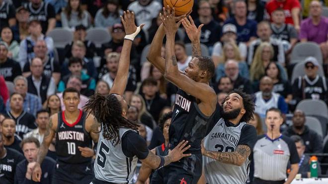 两队连续远投不进,文班亚马空接扣篮打铁,杜兰特2罚1中,哈珀暴扣。芬尼史密斯、福克斯各有上篮打进,文班亚马轰进压哨三分球。半场打完,马刺以69比57领先,火箭单节以24比37落后。